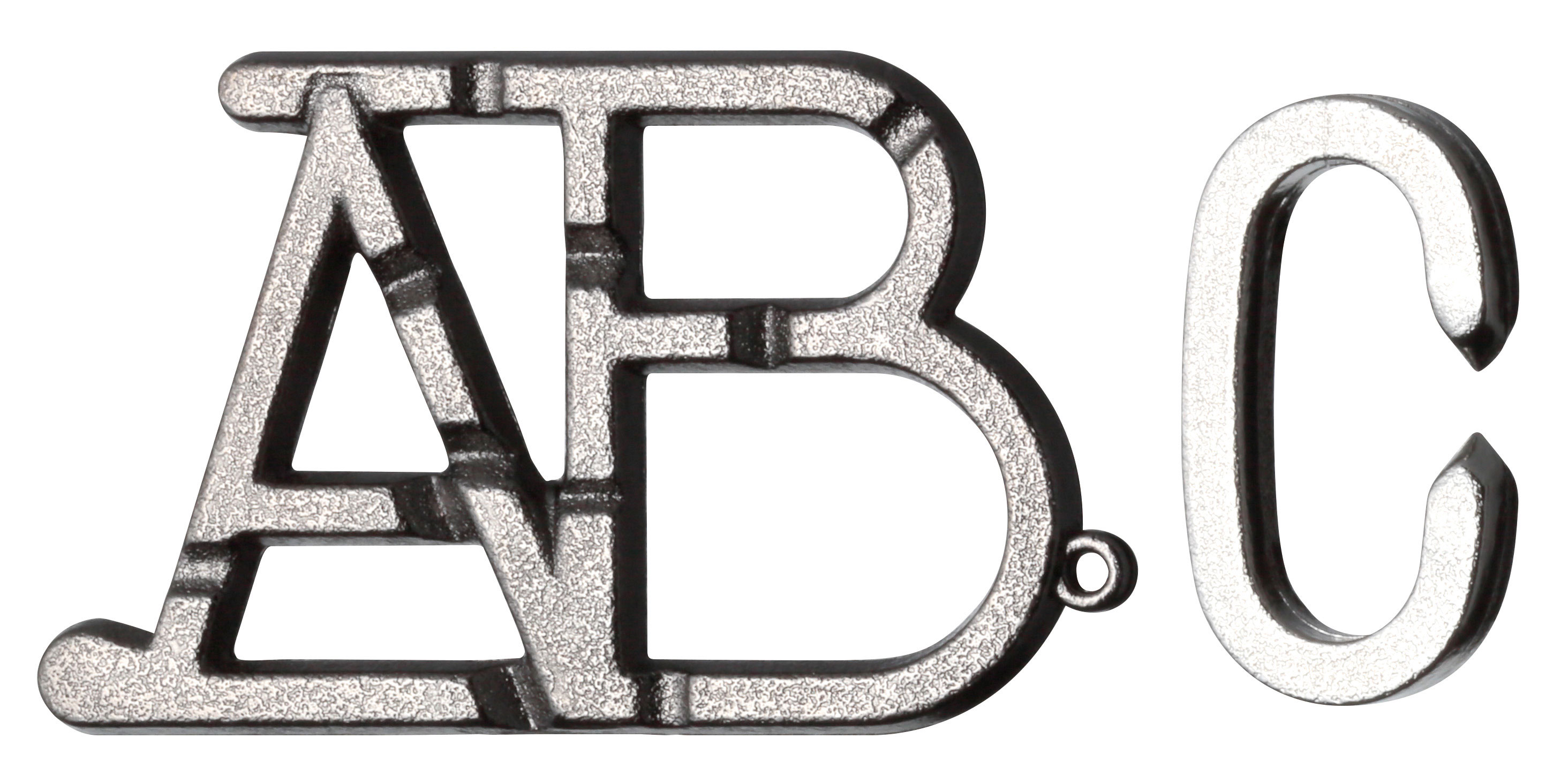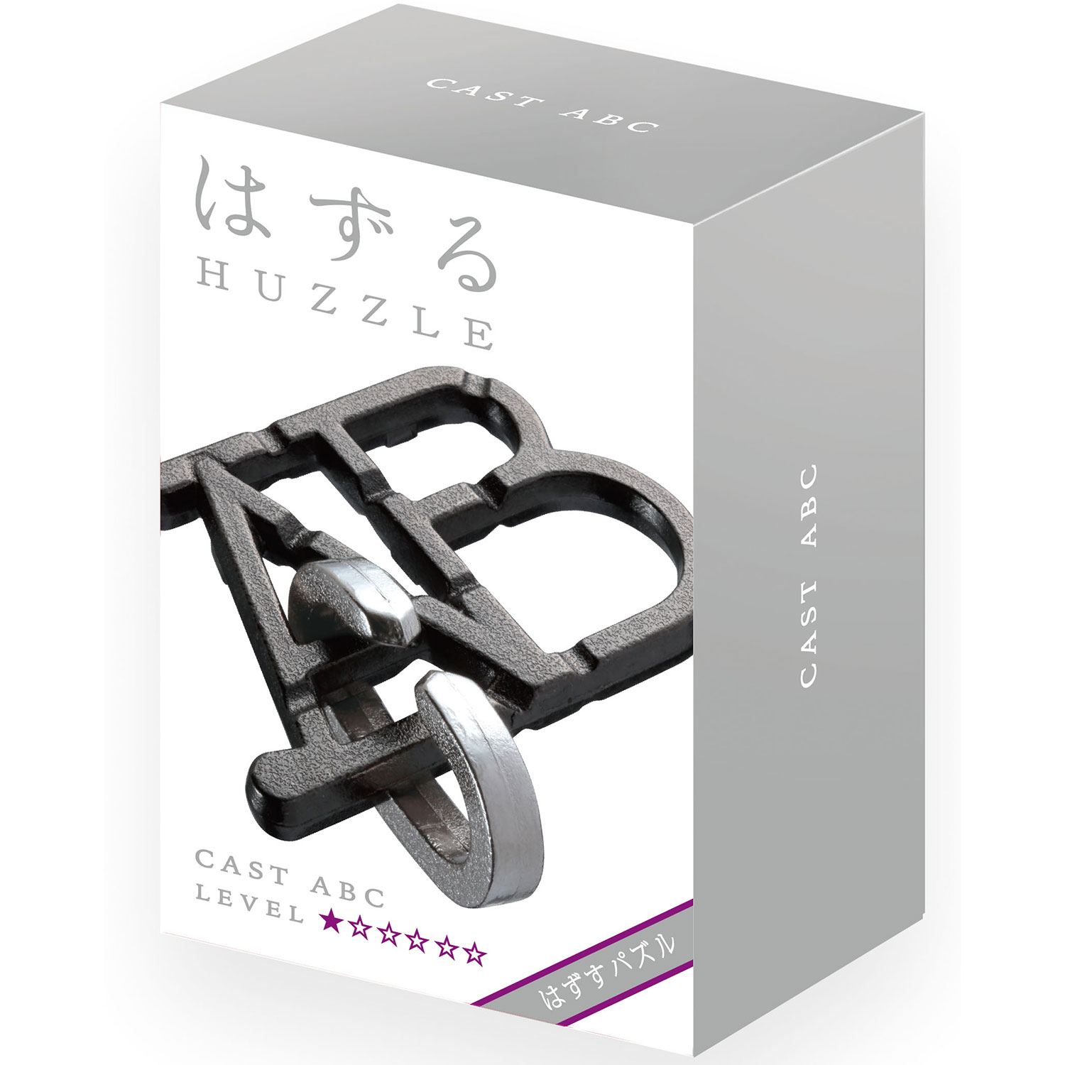 Huzzle Cast Puzzle ABC. Aufgabe des verzwickten Metallpuzzles ist es, die das C von den Buchstaben A und B zu lösen und sie dann wieder zusammenzufügen.