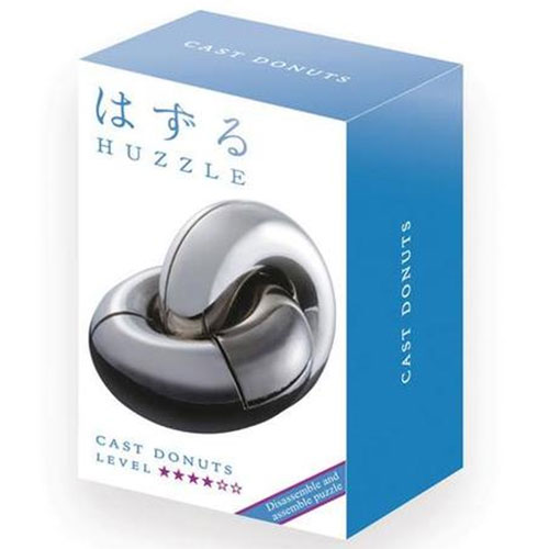 Huzzle Cast Puzzle Donuts in neuer Huzzle-Verpackung. Aufgabe des verzwickten Metallpuzzles ist es, die Teile voneinander zu lösen und wieder zusammenzufügen.