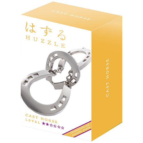 Huzzle Cast Puzzle Horse in neuer Huzzle-Verpackung. Aufgabe des verzwickten Metallpuzzles ist es, die Teile voneinander zu lösen und wieder zusammenzufügen.