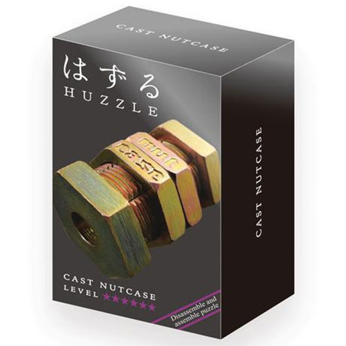 Huzzle Cast Puzzle Nutcase in neuer Huzzle-Verpackung. Aufgabe des verzwickten Metallpuzzles ist es, die Teile voneinander zu lösen und wieder zusammenzufügen.