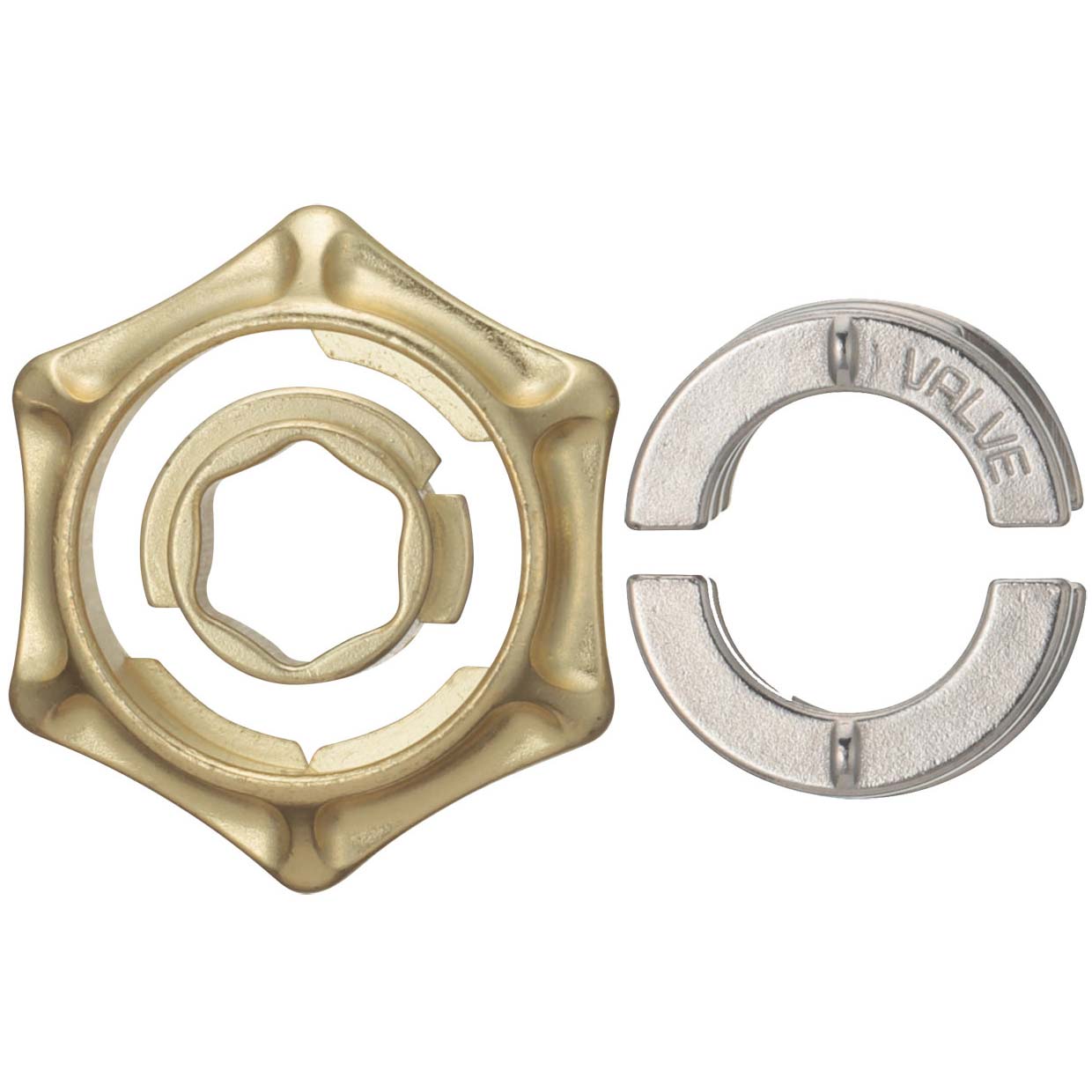 Das Huzzle Cast Valve besteht aus drei Teilen, wobei zwei Elemente zunächst aus der schraubenförmigen Form herausund anschließend wieder hinein gebracht werden müssen.