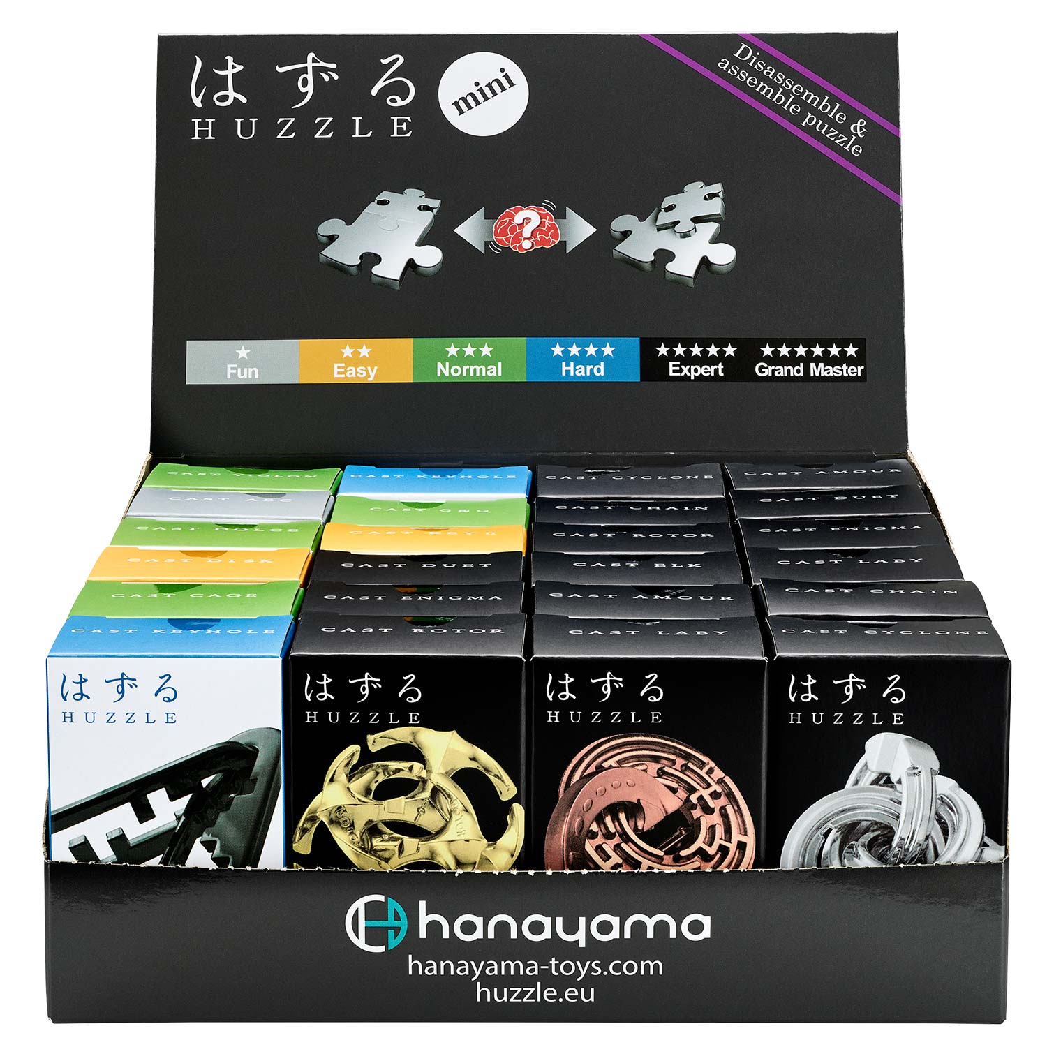 Die Mini Huzzle sind deutlich kleiner als die normalen Huzzle Cast Puzzle, funktionieren aber gleich. Das Display enthält alle bisher in Mini-Version erschienenen Mini Huzzle Puzzle: